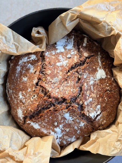 I created this bread using black wheat flour but any good quality wholemeal flour will work. You can start this bread the night before as it rests for 14-18 hours.
